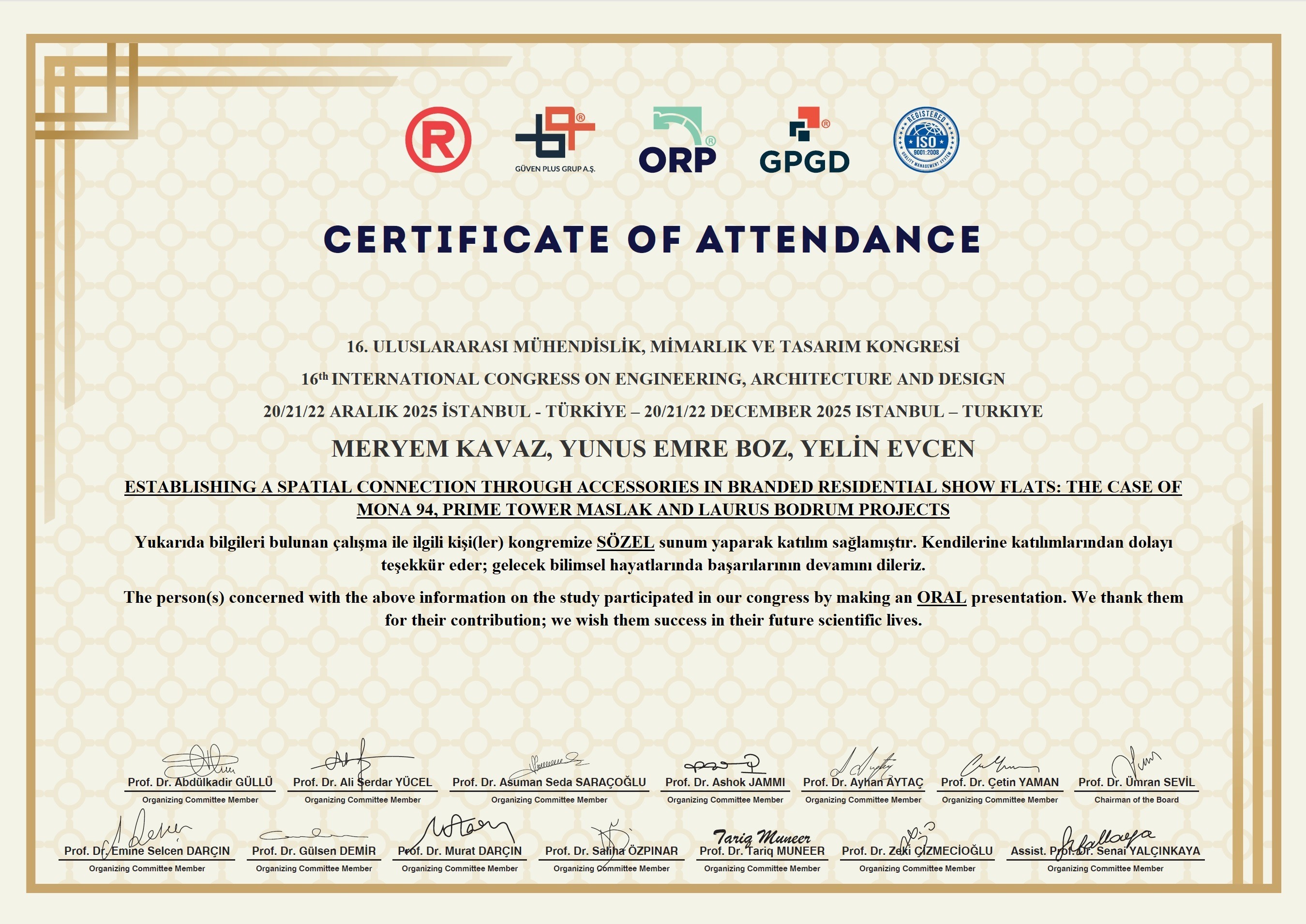 Ekibimizden Meryem Kavaz, Yunus Emre Boz ve Yelin Evcen ile birlikte hazırladığımız “Markalı Konut Örnek Daire Projelerinde Aksesuar ile Mekânsal Bağ Kurmak: Mona 94, Prime Tower Maslak Ve Laurus Bodrum Projeleri Örneği” başlıklı özet bildirimiz, Aralık ayında çevrimiçi olarak düzenlenen 16. Uluslararası Mühendislik, Mimarlık ve Tasarım Kongresi'nde sunulmuştur. Katılımcıların zengin akademik içerikler paylaştığı bu verimli etkinlikte yer almaktan mutluluk duyduk. Kongreyi düzenleyen ekibe ve tüm katılımcılara teşekkür ederiz.